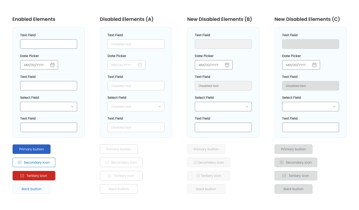 There were several additional challenges and considerations for the design system, including ensuring accessible focus states. While disabled elements aren't required to meet WCAG contrast requirements, I aimed to create disabled states that remained highly readable within the UI.